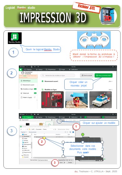 - Paramètre le logiciel FlasPrint pour générer un fichier .gx à envoyer à l'imprimante 3D flashforge (voir TUTORIEL 3) - Paramètre le logicie Bambu Studio pour générer un fichier .gcode à envoyer à l'imprimante 3D Bambulab (voir TUTORIEL 43) |